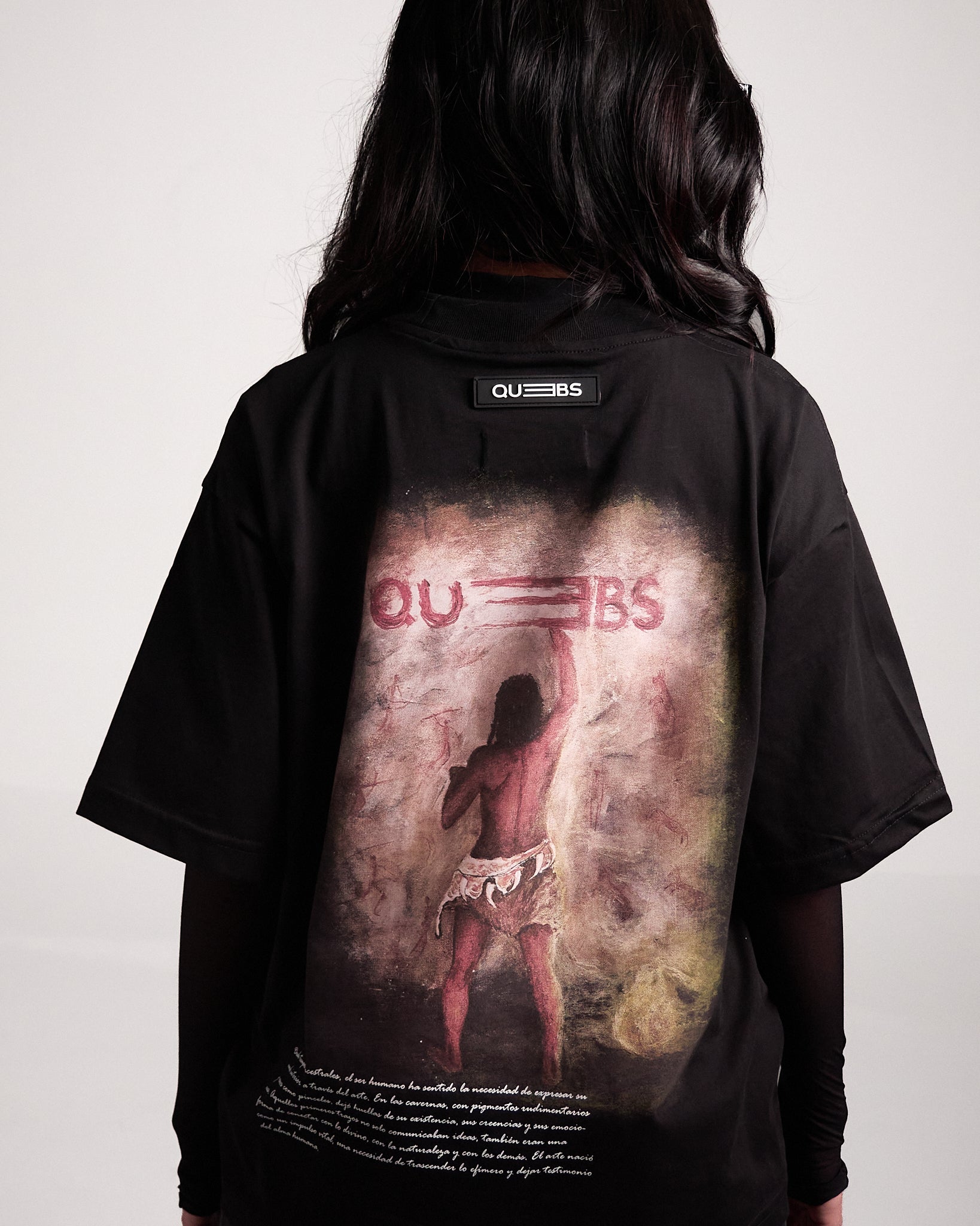 En algodón de 240 g, color negro, con estampados adelante y atrás que reinterpretan el legado del arte rupestre en clave gráfica y urbana. Una camiseta versátil y contemporánea.