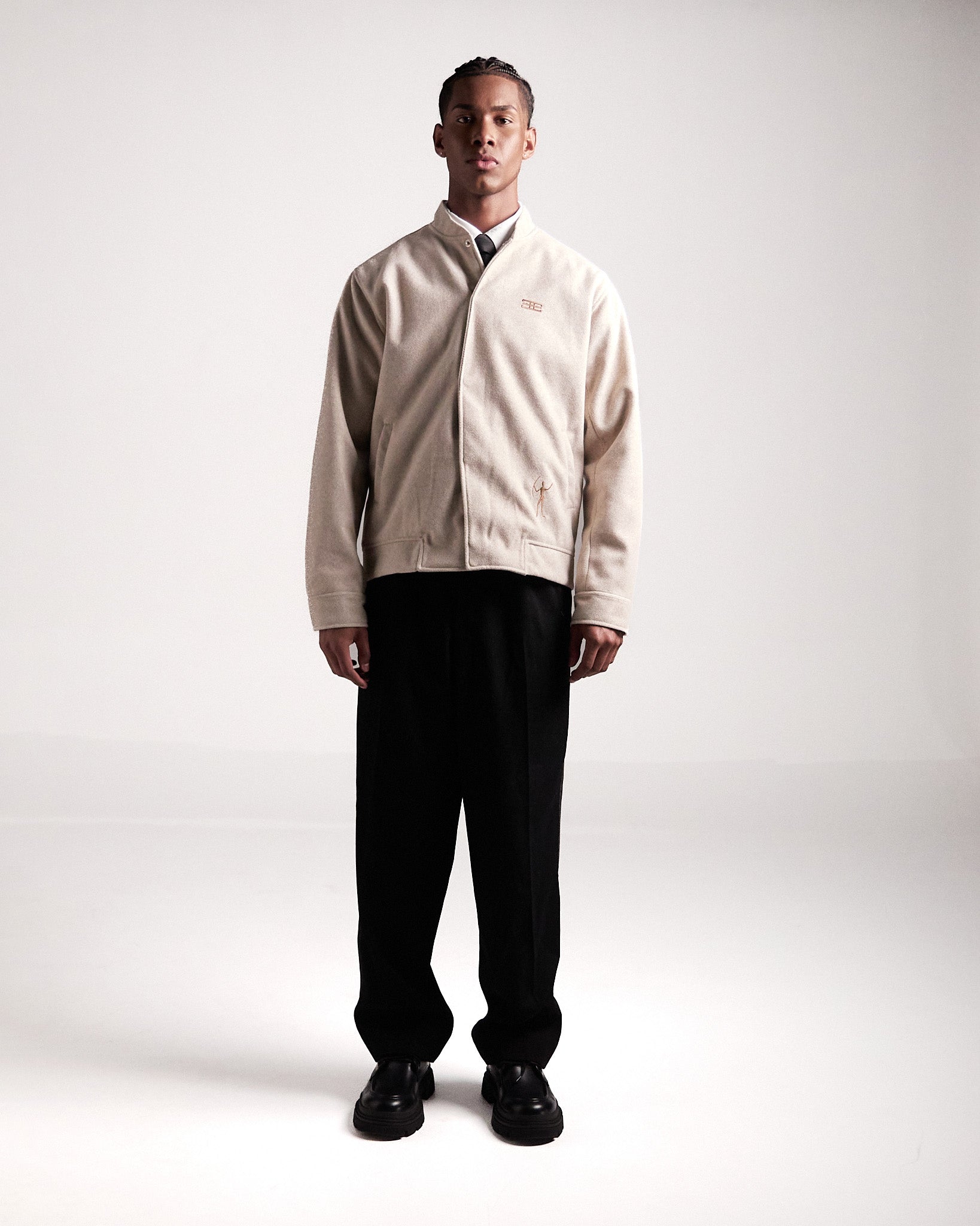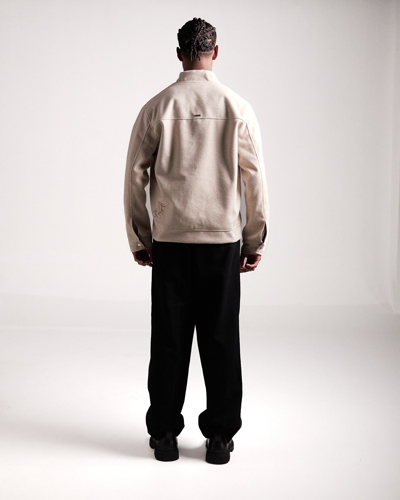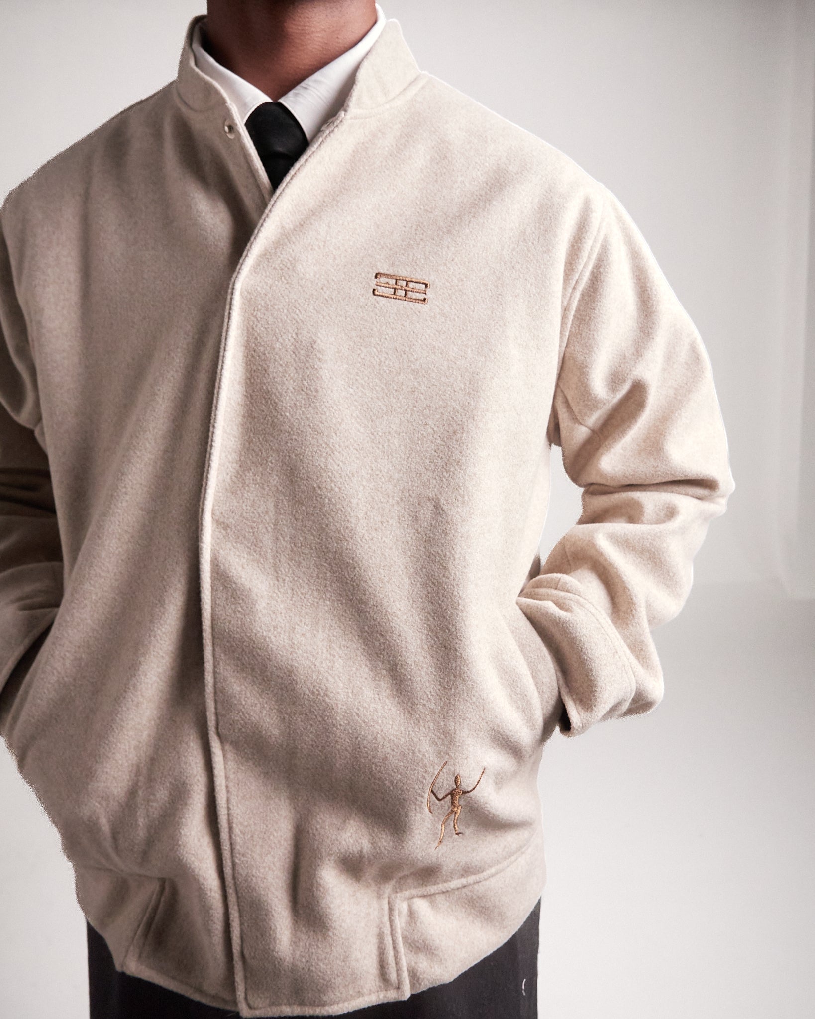 Elaborada en paño Manchester con forro fino, en color beige, esta chaqueta destaca por su silueta única y versatilidad. Los bordados inspirados en figuras rupestres dialogan con detalles de diseño exclusivos, como los broches en las mangas contramarcados con el isotipo de la marca.