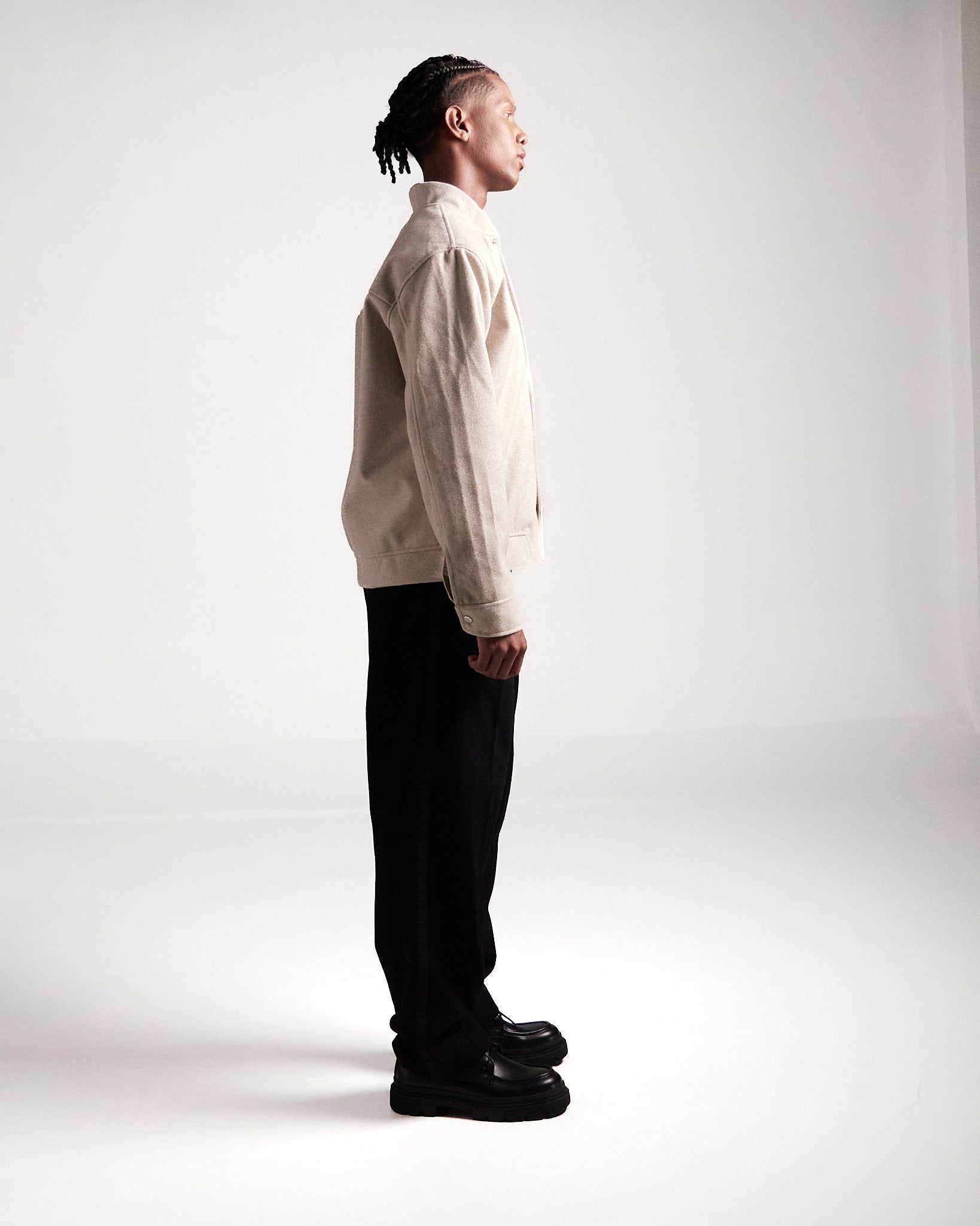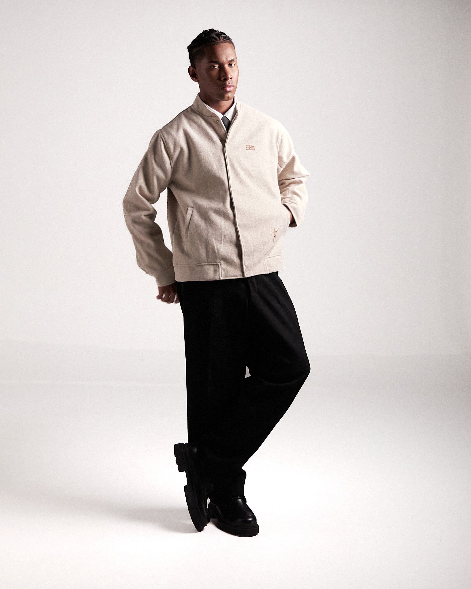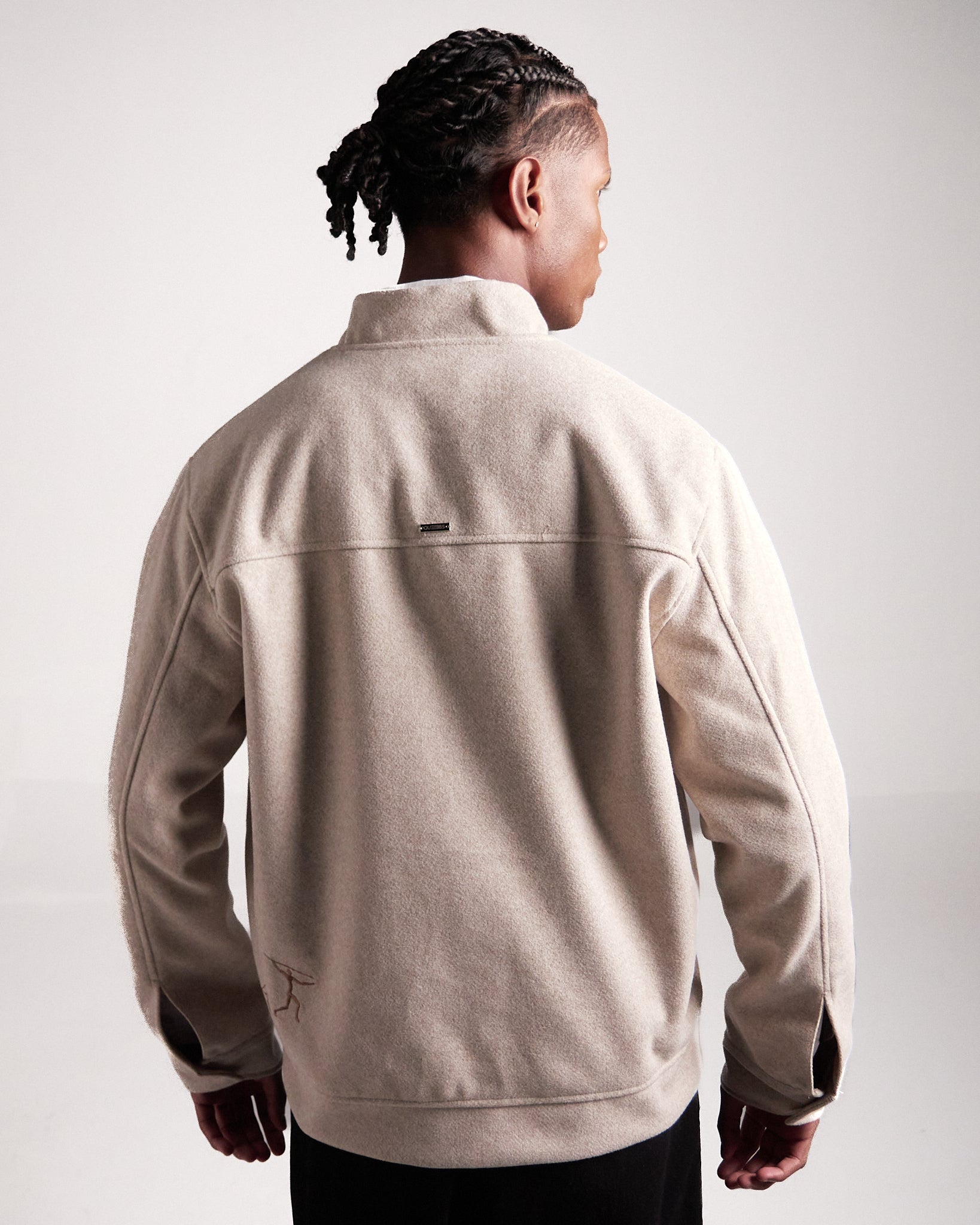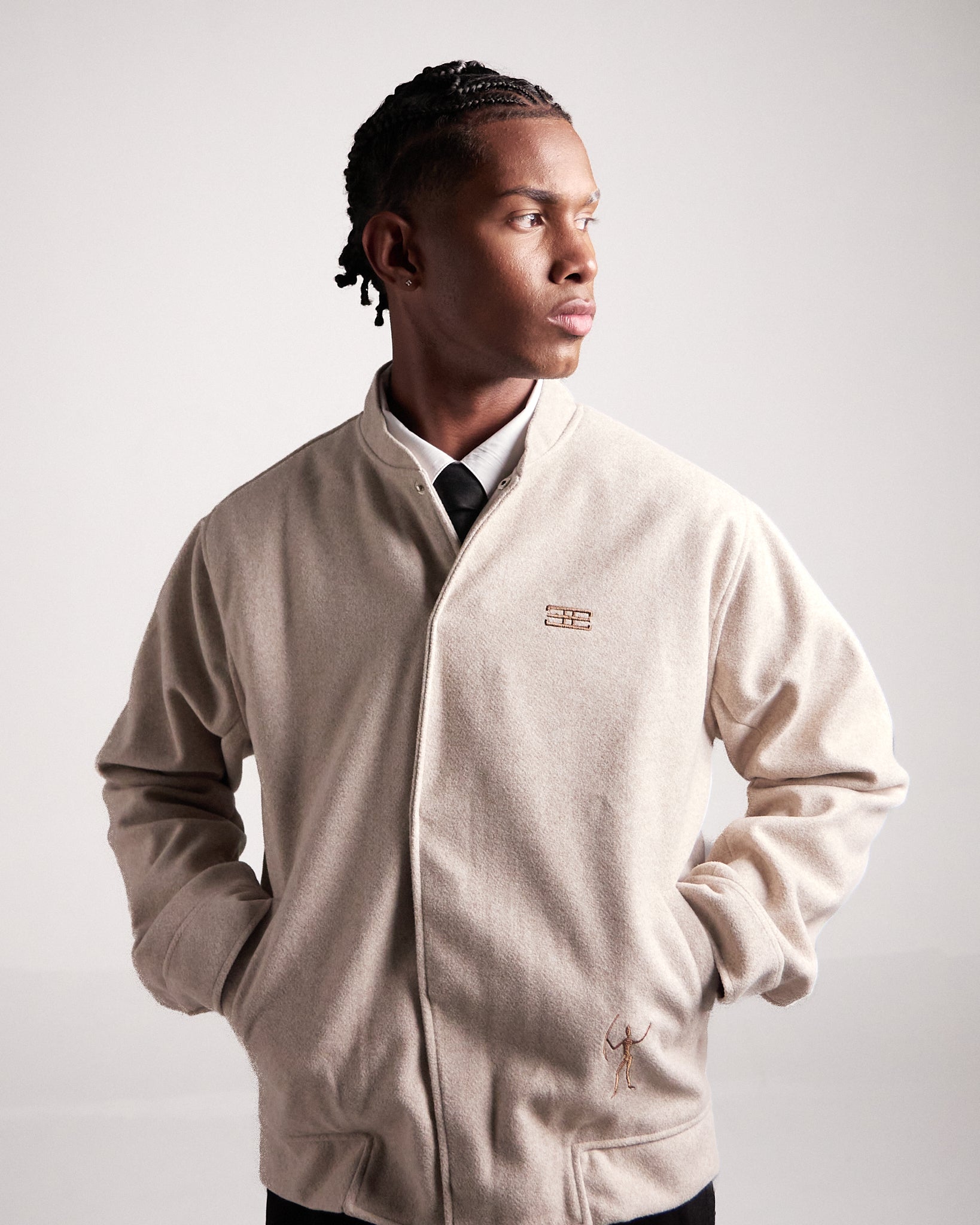 Elaborada en paño Manchester con forro fino, en color beige, esta chaqueta destaca por su silueta única y versatilidad. Los bordados inspirados en figuras rupestres dialogan con detalles de diseño exclusivos, como los broches en las mangas contramarcados con el isotipo de la marca.