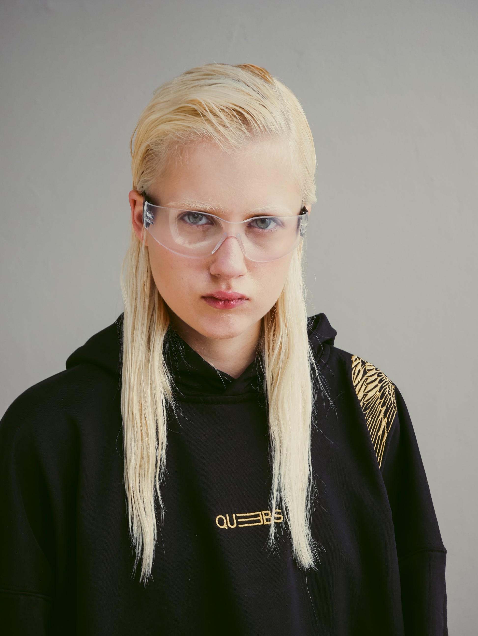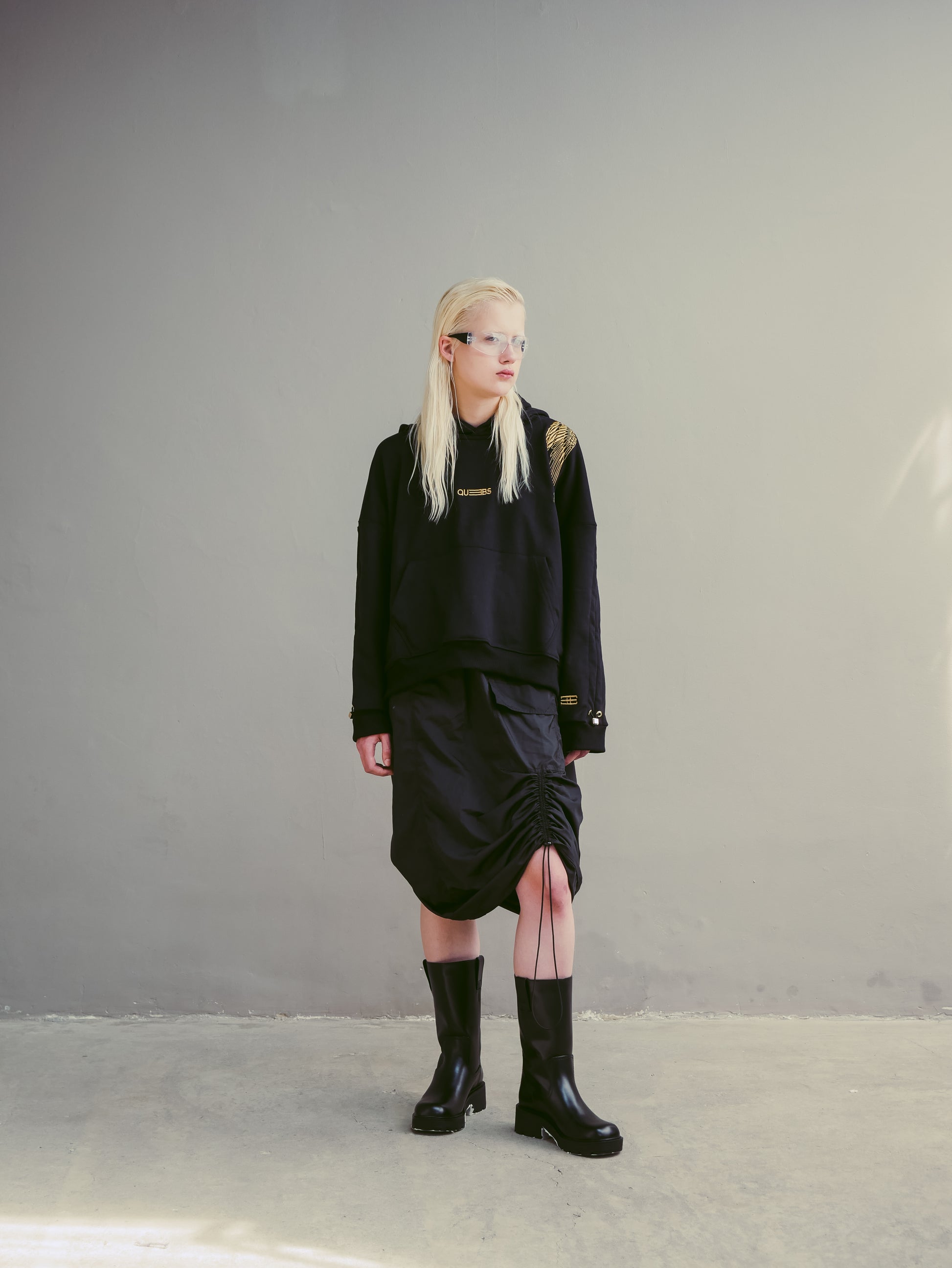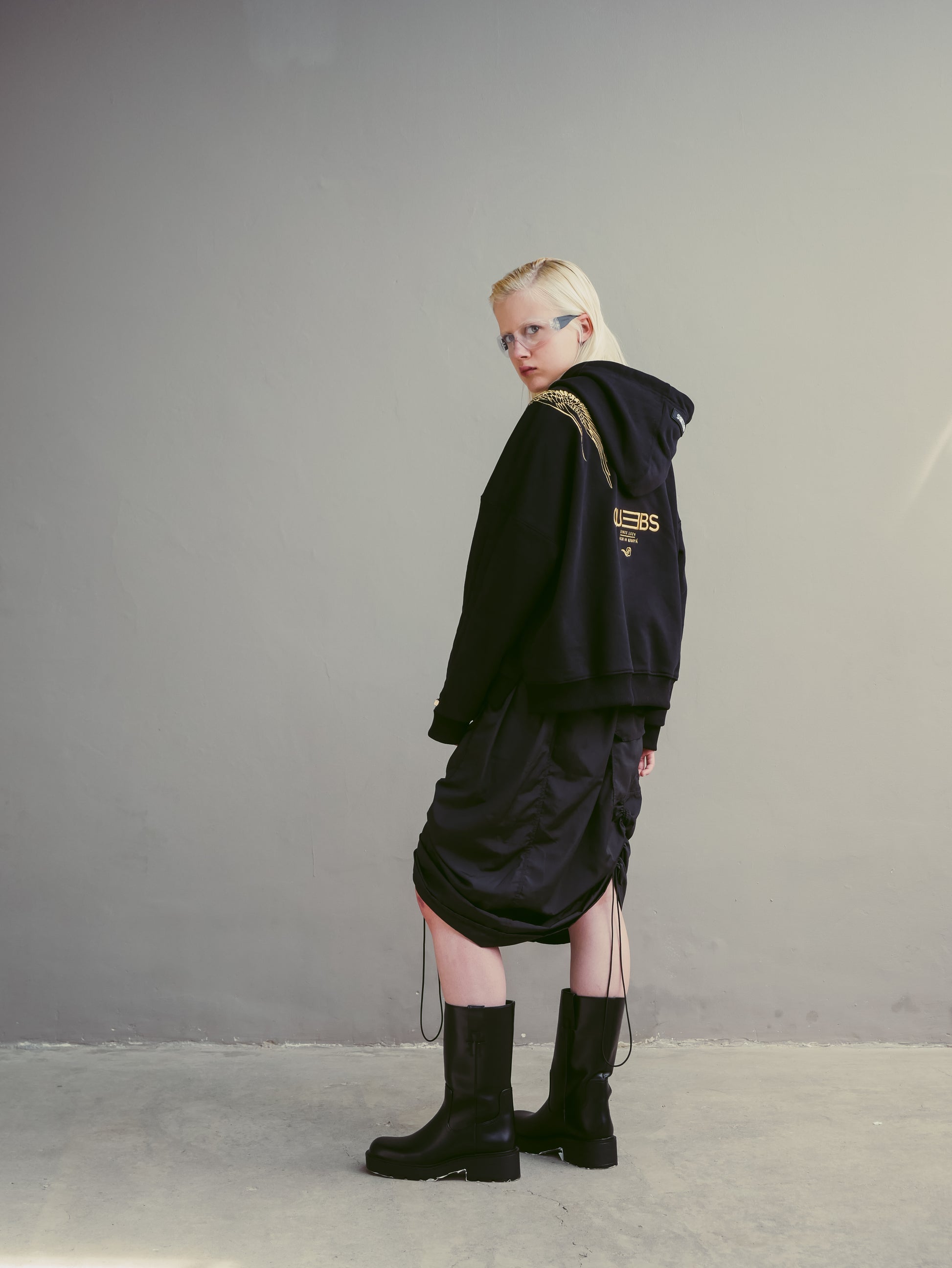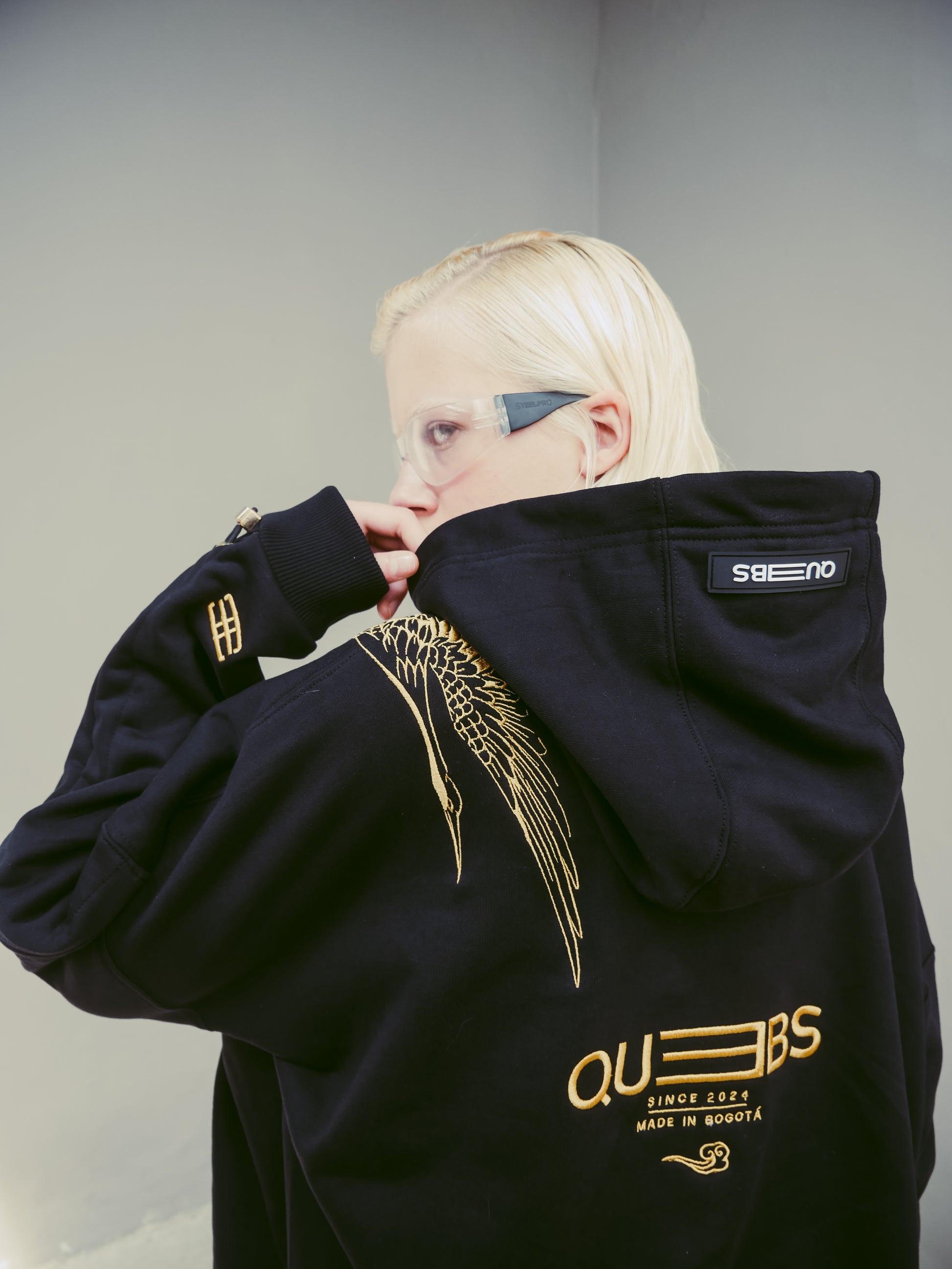 El detalle principal es el espectacular bordado de una grulla dorada que va desde la parte frontal hasta la espalda, creando un diseño llamativo y sofisticado. Además, el logotipo de Quebs Couture está bordado en dorado en la parte frontal, con el isotipo bordado en la manga izquierda. Las aperturas en los costados añaden fluidez al corte boxy fit, y los ajustadores metálicos dorados permiten recoger las mangas para mayor versatilidad.