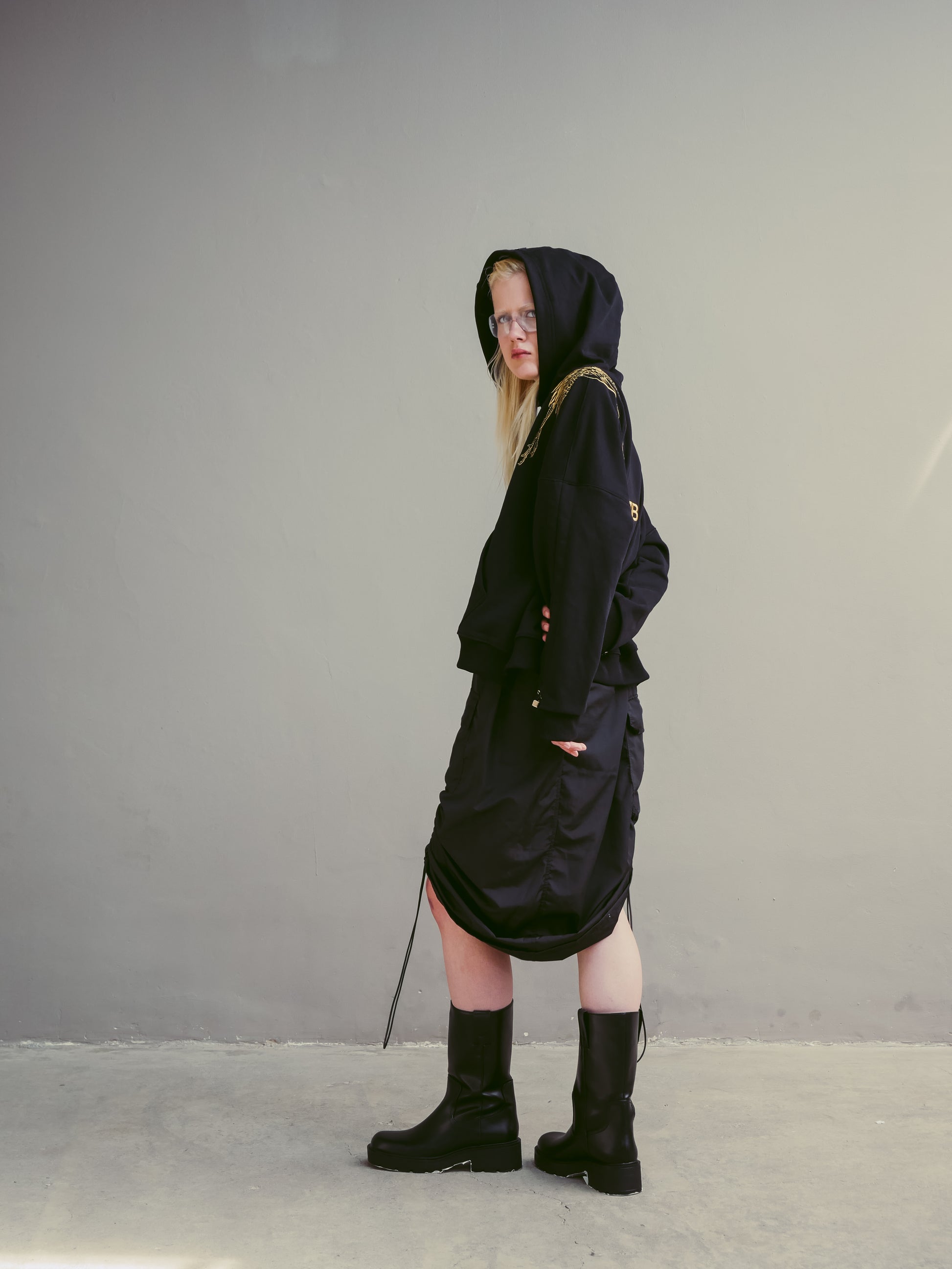 Hoodie Boxy Fit Negro - Bordado de Grulla en Dorado