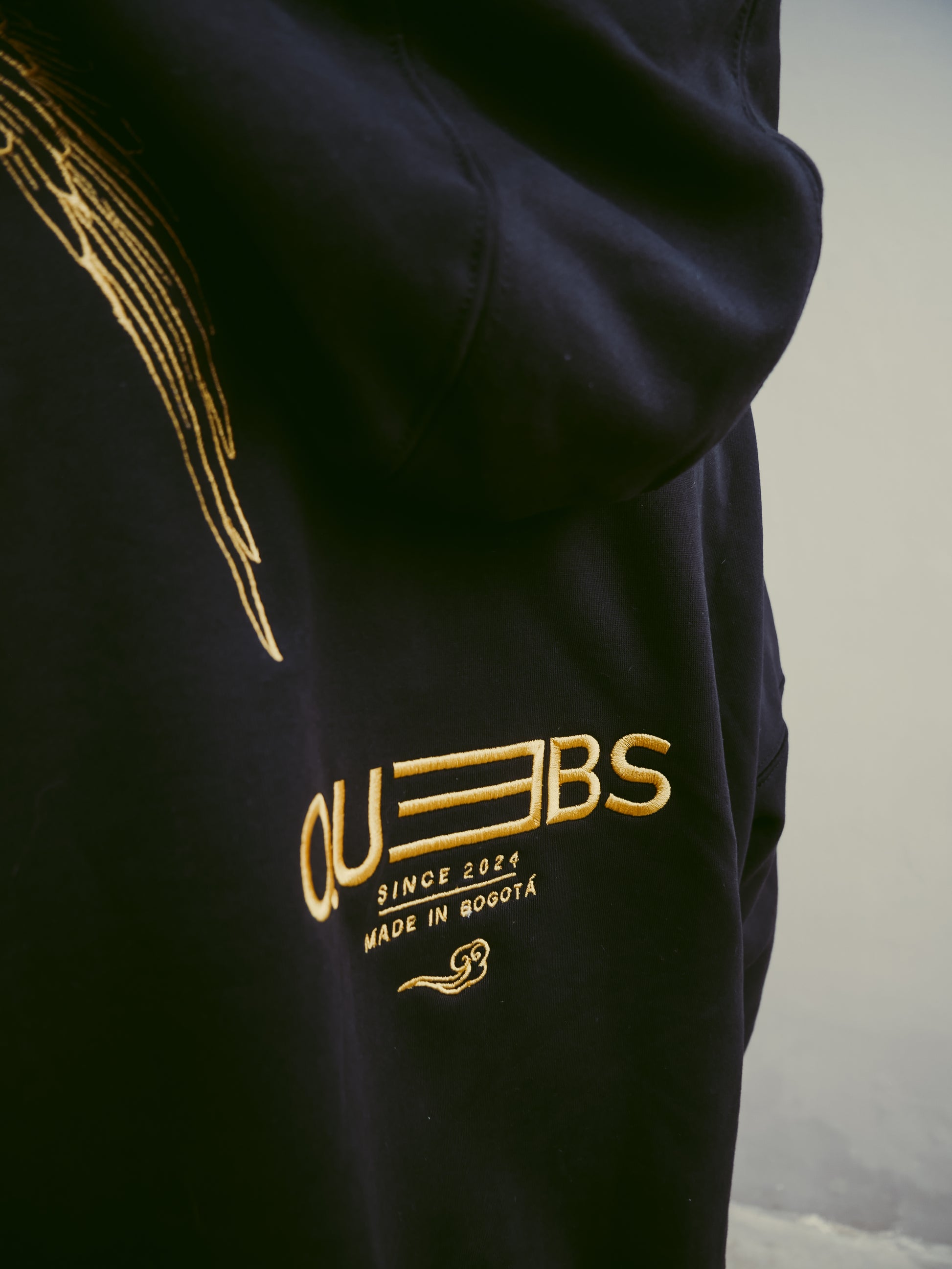 • Logotipo Quebs Couture bordado en la parte frontal y isotipo en la manga izquierda