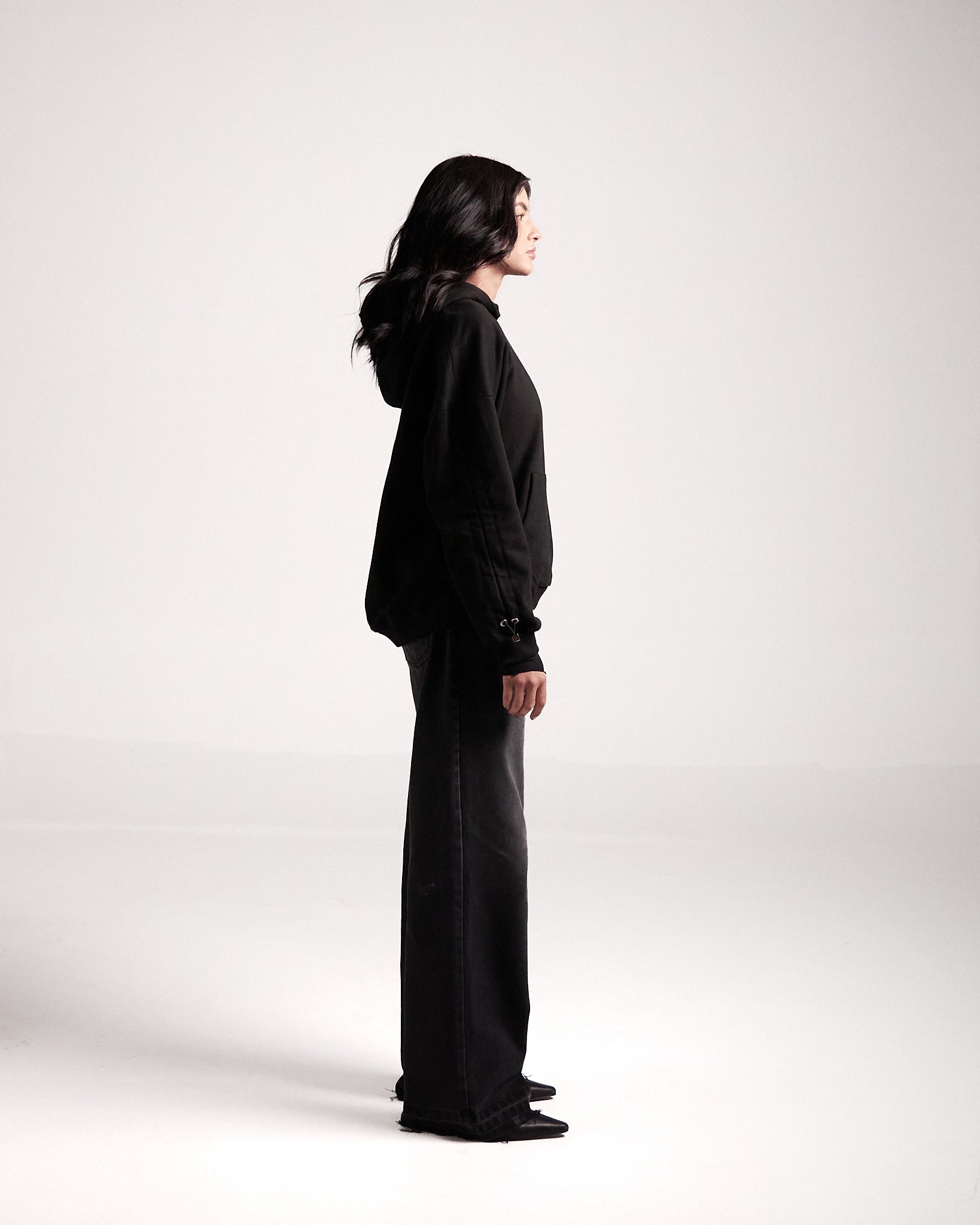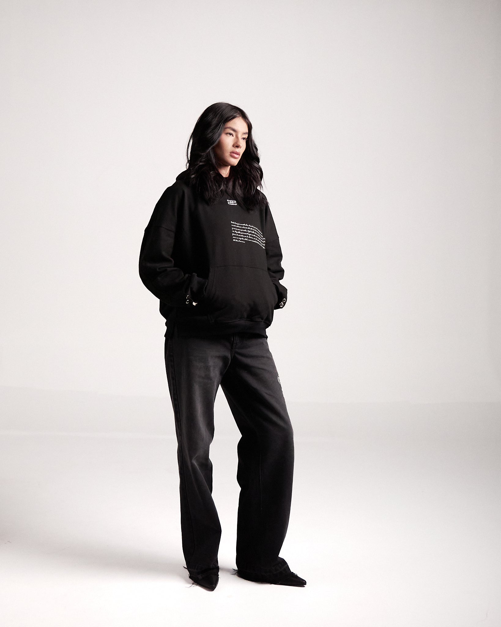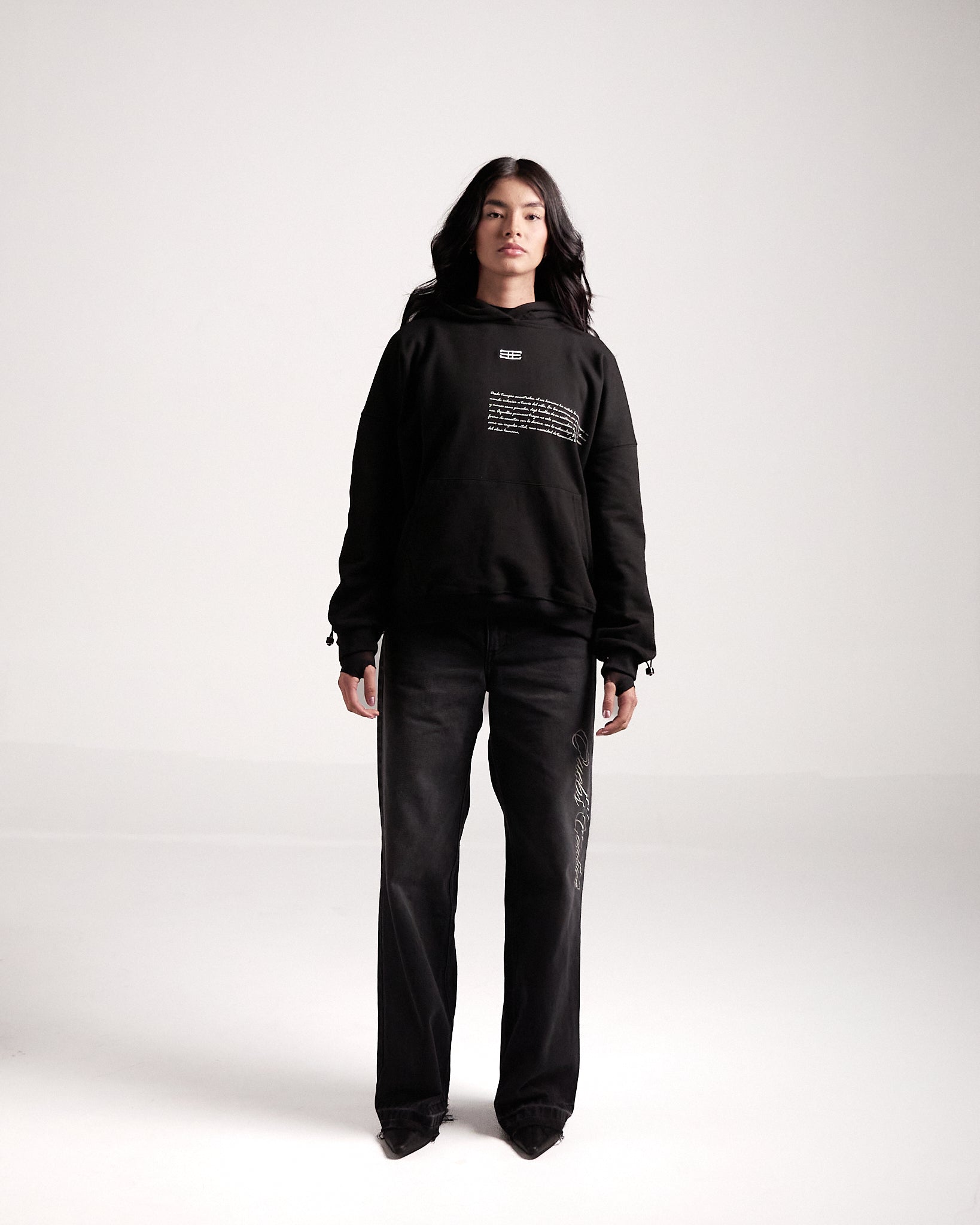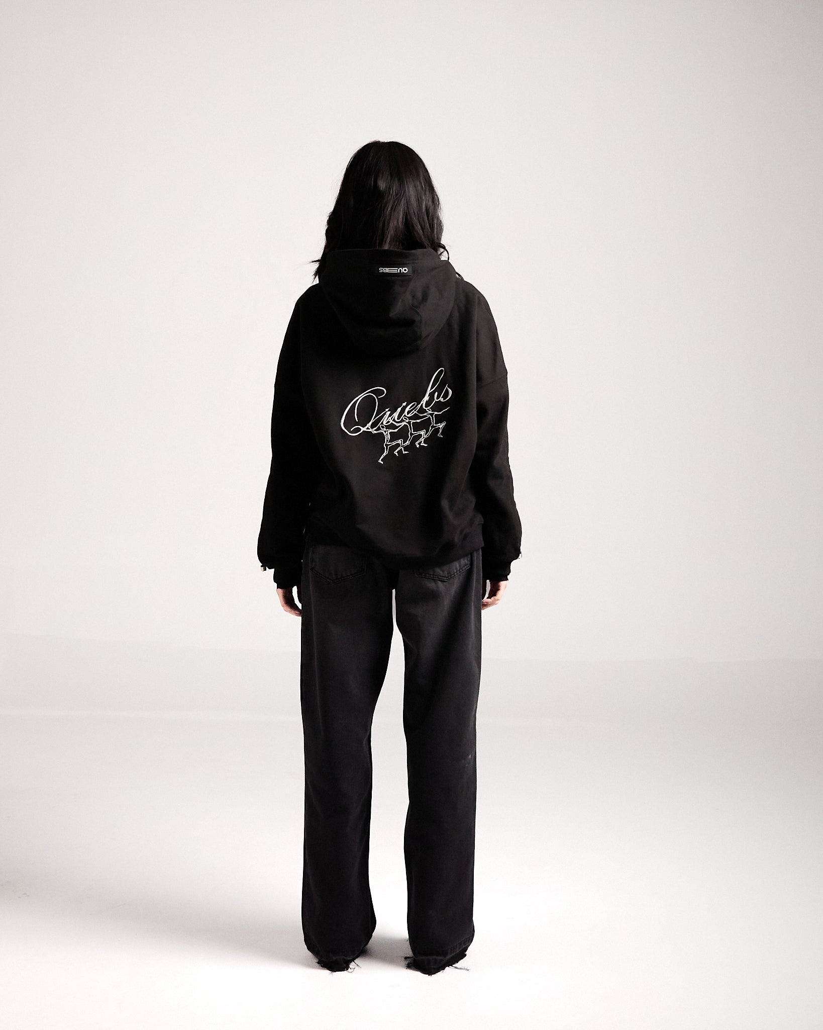 Hoodie 100% algodón de 400 g, diseñado para destacar. En el frente, un estampado que narra la historia de la colección; en la espalda, un bordado que fusiona el nombre de Quebs Couture con símbolos rupestres. Una prenda icónica de la colección.